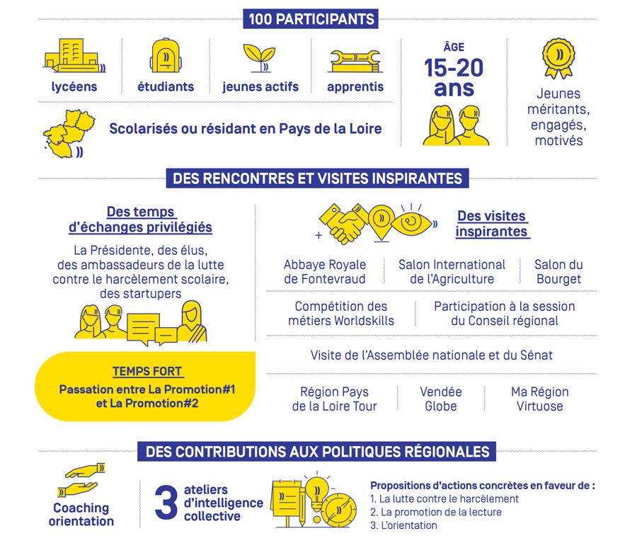 Pour la deuxième année consécutive, la Région des Pays de la Loire propose à 100 jeunes d’intégrer La Promotion et de venir enrichir la réflexion qu’elle mène autour des actions quotidiennes en direction de la jeunesse. Après une première année fructueuse consacrée au thème de l’orientation en 2023/2024, la seconde édition de La Promotion a débuté en octobre 2024 et fut consacrée à différentes thématiques au cours de l’année, la première était sur le thème du harcèlement, la seconde sur le prix littéraire lycéen.