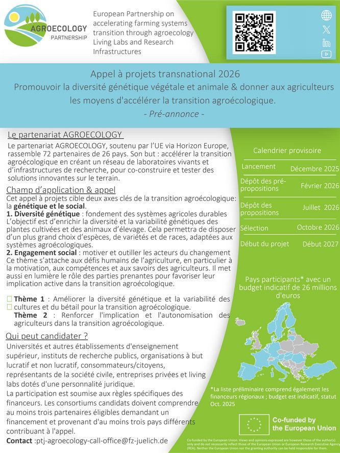 • L’appel s’intitule « Fostering plant and animal genetic diversity and empowering farmers to accelerate the agroecological transition ».