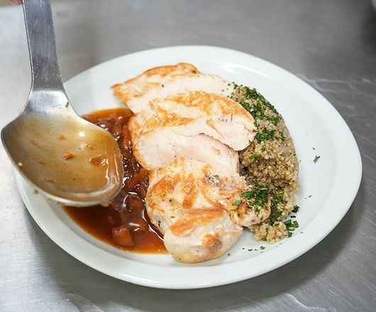 - Commencer par mettre le risotto de quinoa puis la volaille puis arroser de sauce.