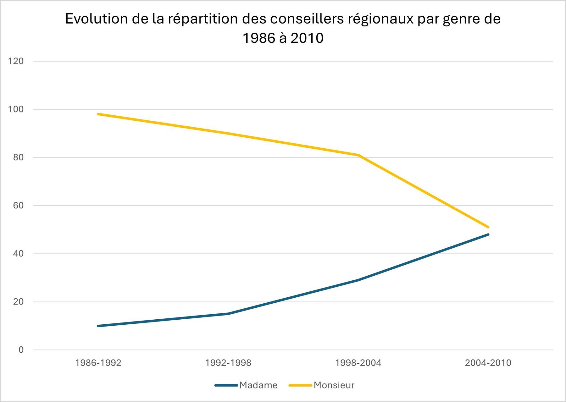 La proportion de conseillères régionales augmente ensuite progressivement jusqu’à atteindre l’équilibre grâce à la loi constitutionnelle n° 99-569 du 8 juillet 1999 qui complète l’article 3 de la Constitution en posant que "la loi favorise l’égal accès des femmes et des hommes aux mandats électoraux et fonctions électives" et l’application de la loi n°2000-493 du 6 juin 2000 tendant à favoriser l'égal accès des femmes et des hommes aux mandats électoraux et fonctions électives (dite sur « loi sur la parité » ou loi Guigou).